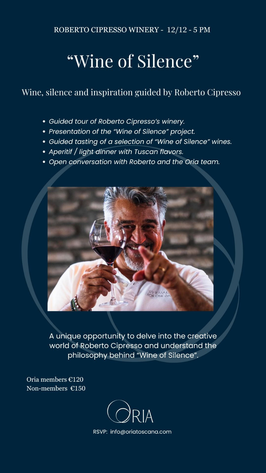 Pour participer à cette expérience unique et confirmer votre présence, veuillez envoyer un courriel à : info@oriatoscana.com.